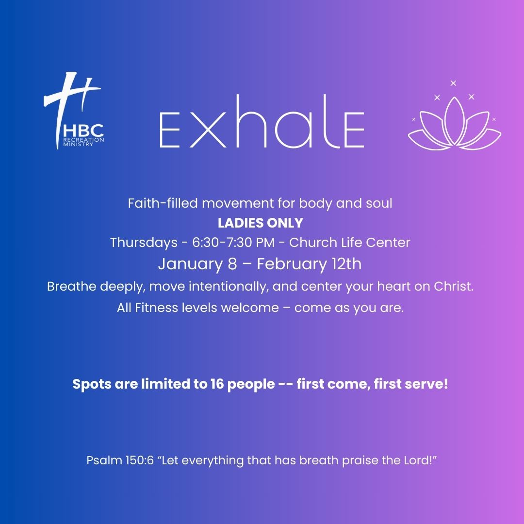 A Ladies fitness opportunity will be available on Thursday nights for 6 weeks beginning January 8th. Spots are limited to 16 people -- first come, first serve! Opportunity to breathe deeply, move intentionally, and center your heart on Christ. All Fitness levels welcome – come as you are. Psalm 150:6 “Let everything that has breath praise the Lord!”